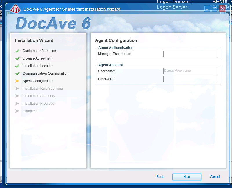 Then you have to enter the passphrase generated during DocAve installation and a service user account to run the DocAve agent service.