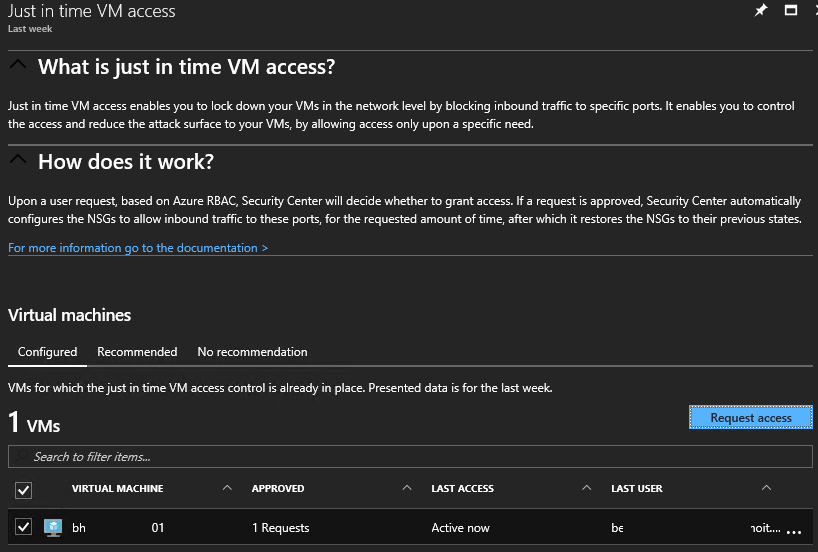 Once activated, the JIT Access blade will be refreshed showing the protected VM’s, with details regarding the number of requests including last user logged