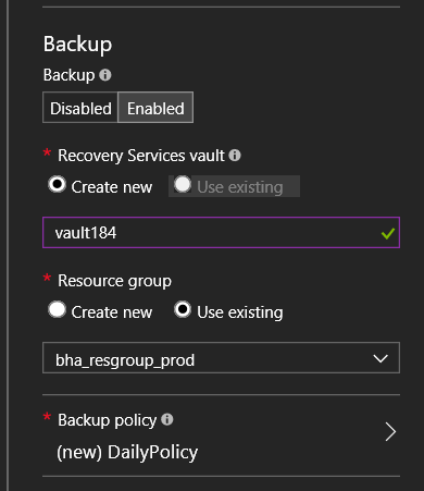 By default, the backup option is Disabled; when you enable it, you will then define the Recovery Service Vault to use and create the policy (or select one if already exist)