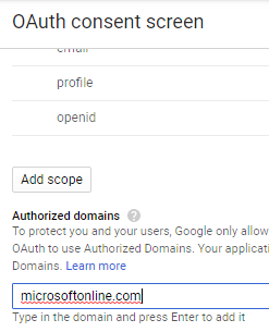 There define the application details and define the Authorized domains with the value microsoftonline.com