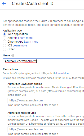Select Web application and define the settings with Authorized redirect URIs set to: