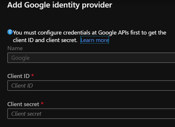 New-AzureADMSIdentityProvider -Type Google -Name Google -ClientId [Client ID] -ClientSecret [Client secret]