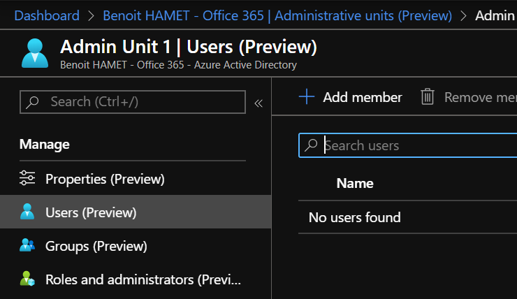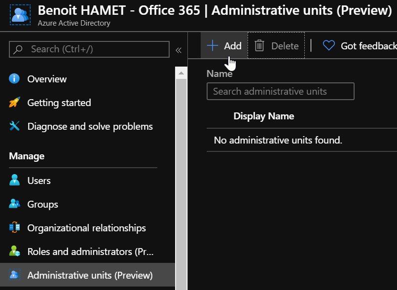 Then you can create your administrative unit using the Add button – off course if you already used the PowerShell command, your existing AU’s will be displayed there too