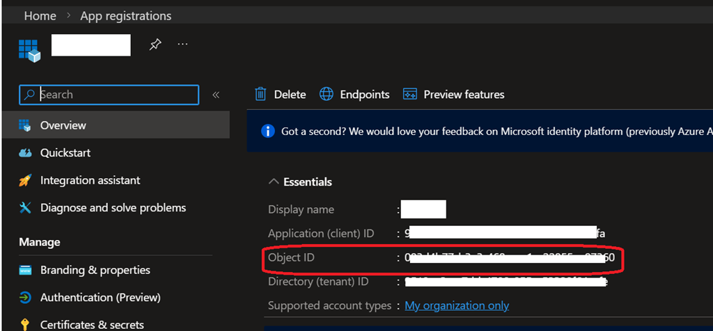 You will need to get the registered application object ID either from the Entra ID portal or Graph API (GET https://graph.microsoft.com/v1.0/applications})