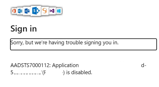 AADSTS7000112: Application ‘<removed – application id> (<removed – application display name>) is disabled.