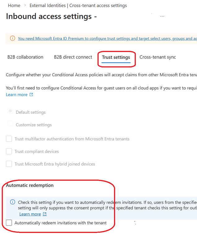 Then you need to ensure the Automatically redeem invitations (available from the Trust Settings of the organization link) is enabled on both tenant; in the source this must be configured from the Outbound access\Trust settings blade in the source tenant